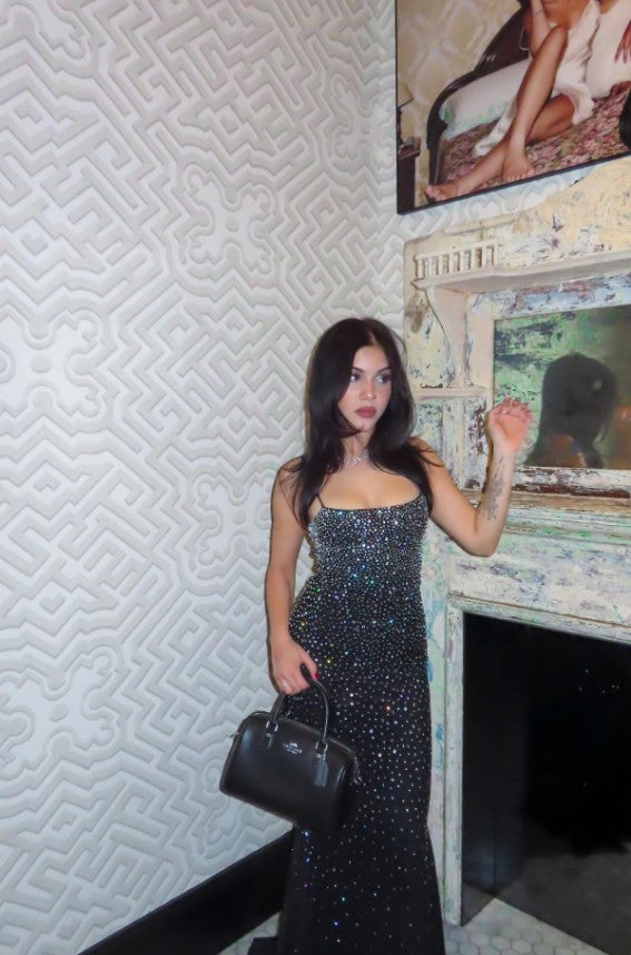 This show-stopping maxi is crafted from premium stretch mesh, drenched in a stunning gradient of multi-shaped rhinestones that catch the light from every angle. The elegant square neckline and delicate shoulder straps frame your décolletage beautifully, while the open lace-up back adds a seductive and sophisticated touch.