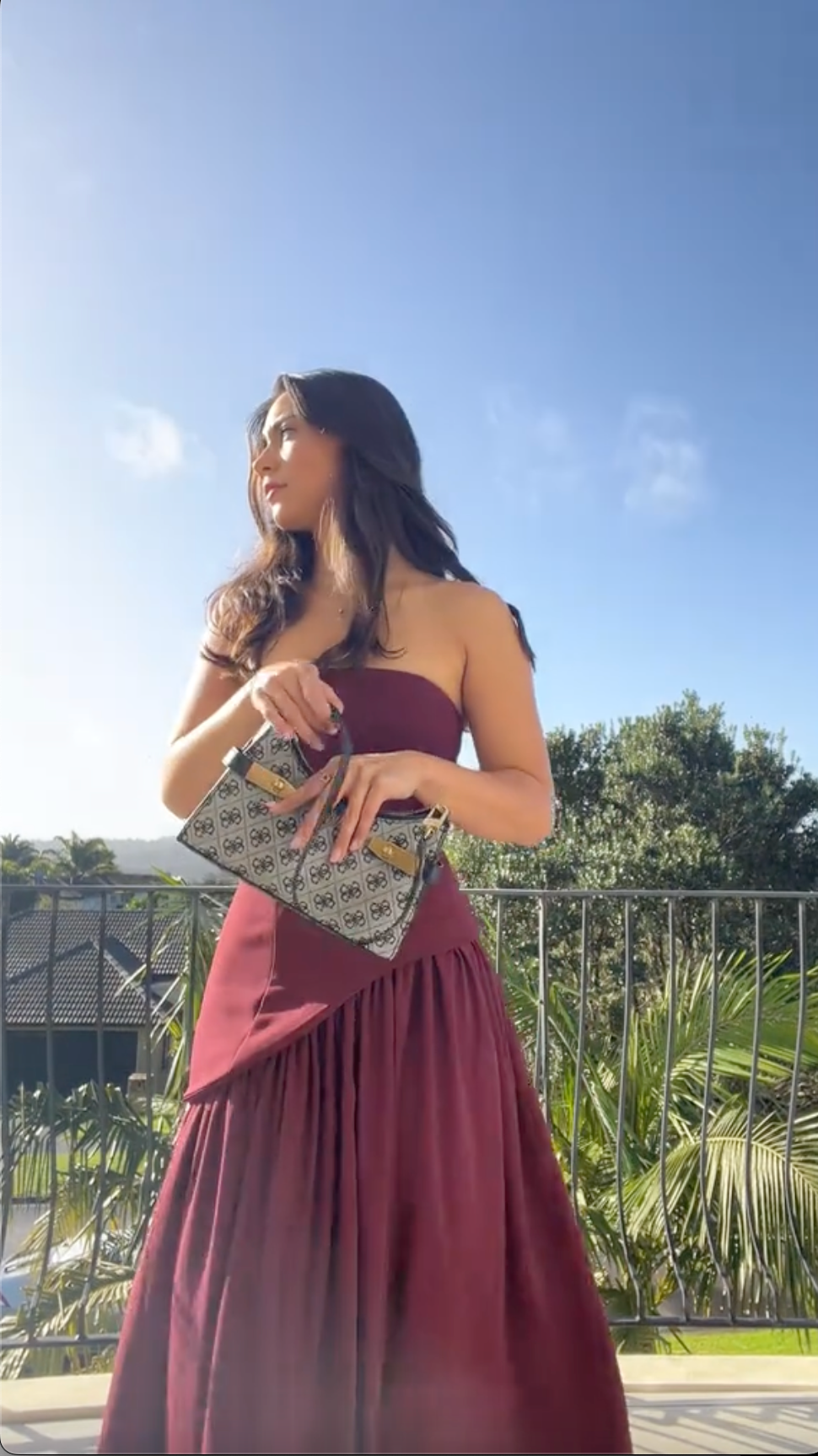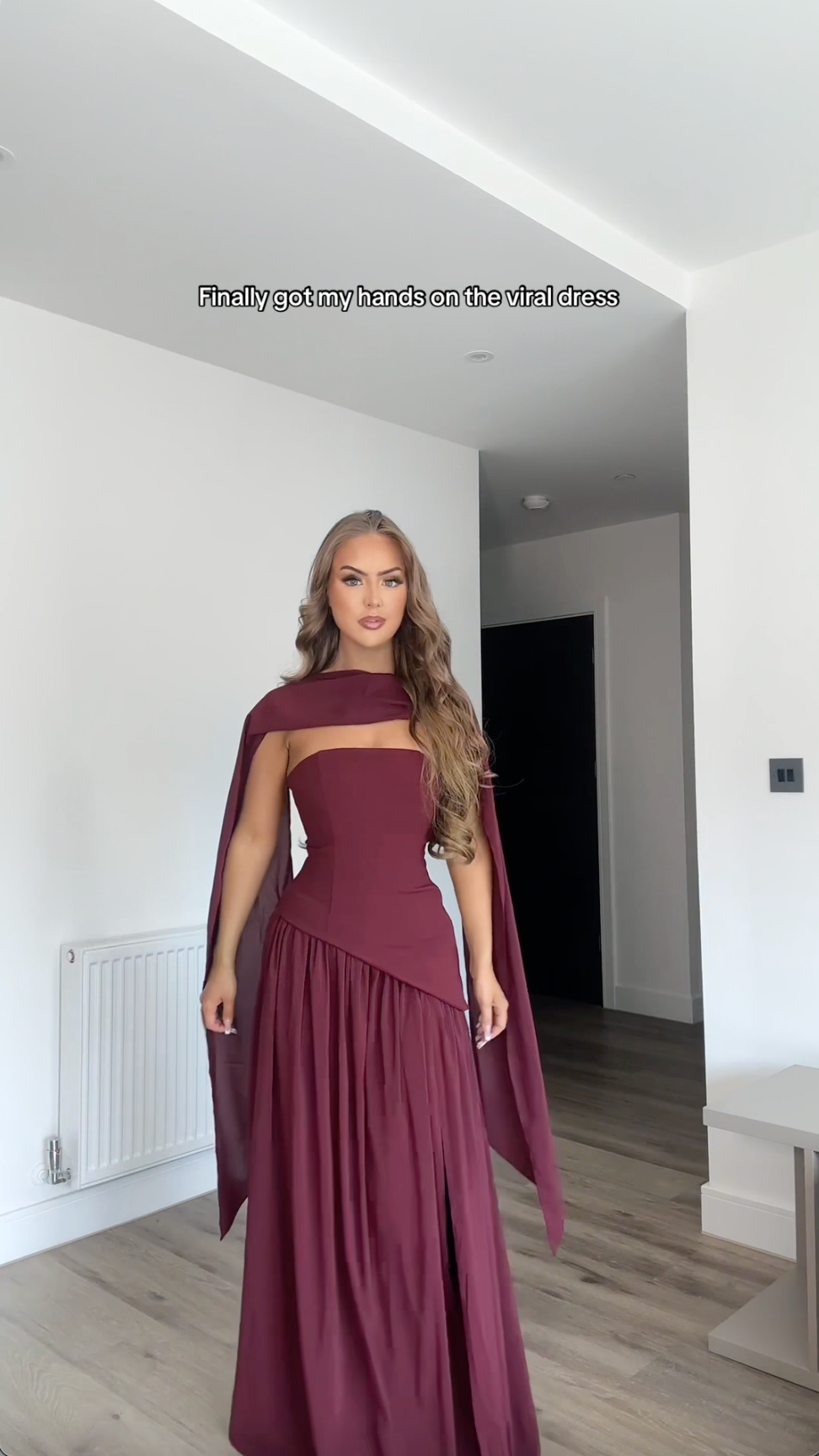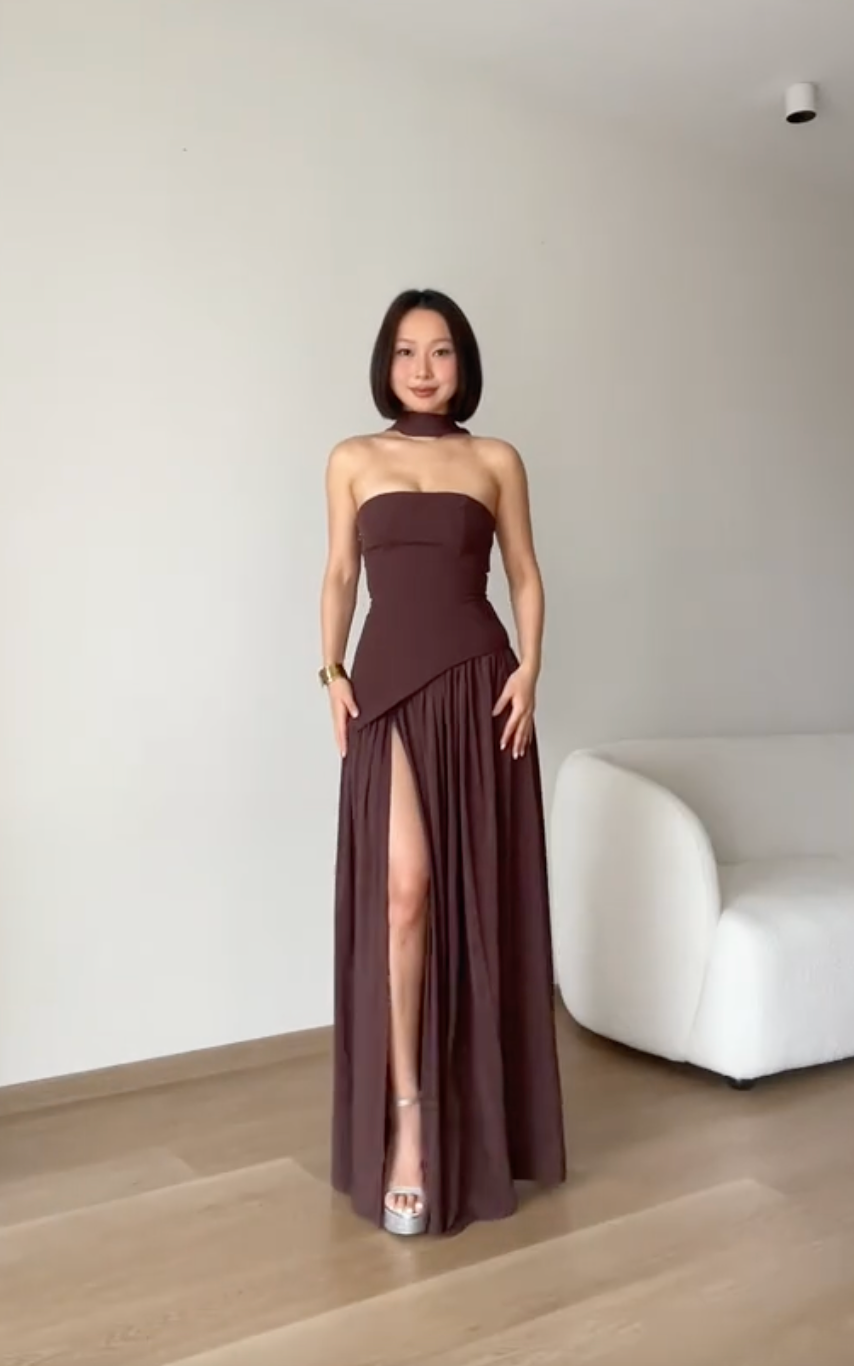 You'll fall in love with the timeless elegance of our Serena Maxi Dress in deep cherry lacquer. Crafted from luxurious crepe fabric, this gown features a structured bodice with delicate lace-up detailing at the back, creating a sculpted, hourglass silhouette. The asymmetrical draped waist flatters every curve, while the full gathered chiffon skirt flows beautifully with every step. A soft matching scarf adds a touch of refined femininity, completing this graceful look designed to captivate from every angle.
