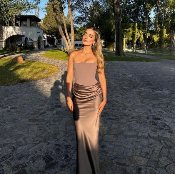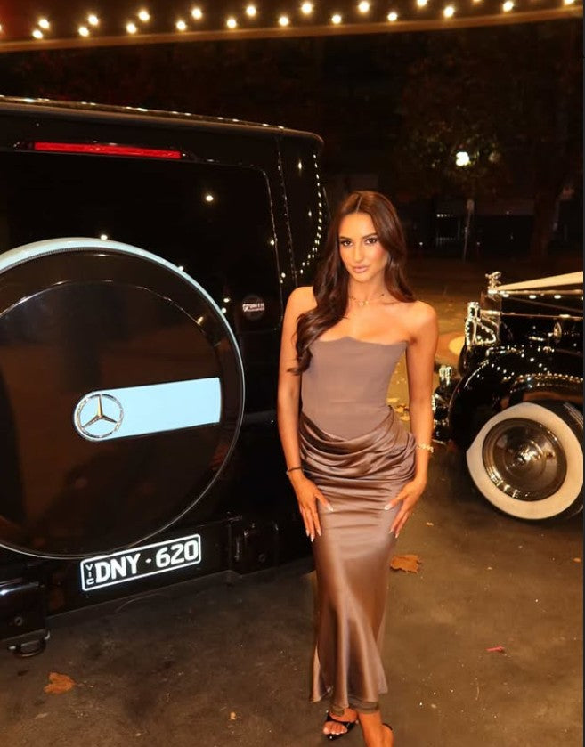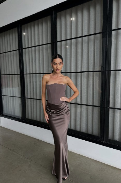 The 'Rosalind' is all out, divine feminine glamour, and we make no apologies for it. This staple Almond Muse style showcases our signature corsetry and refined shaping like no other. The boned bodice is crafted from a stretch crepe that lifts and cinches in all the right places. It fastens with an easy zip at the back.