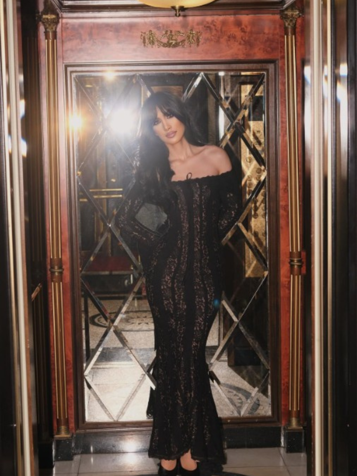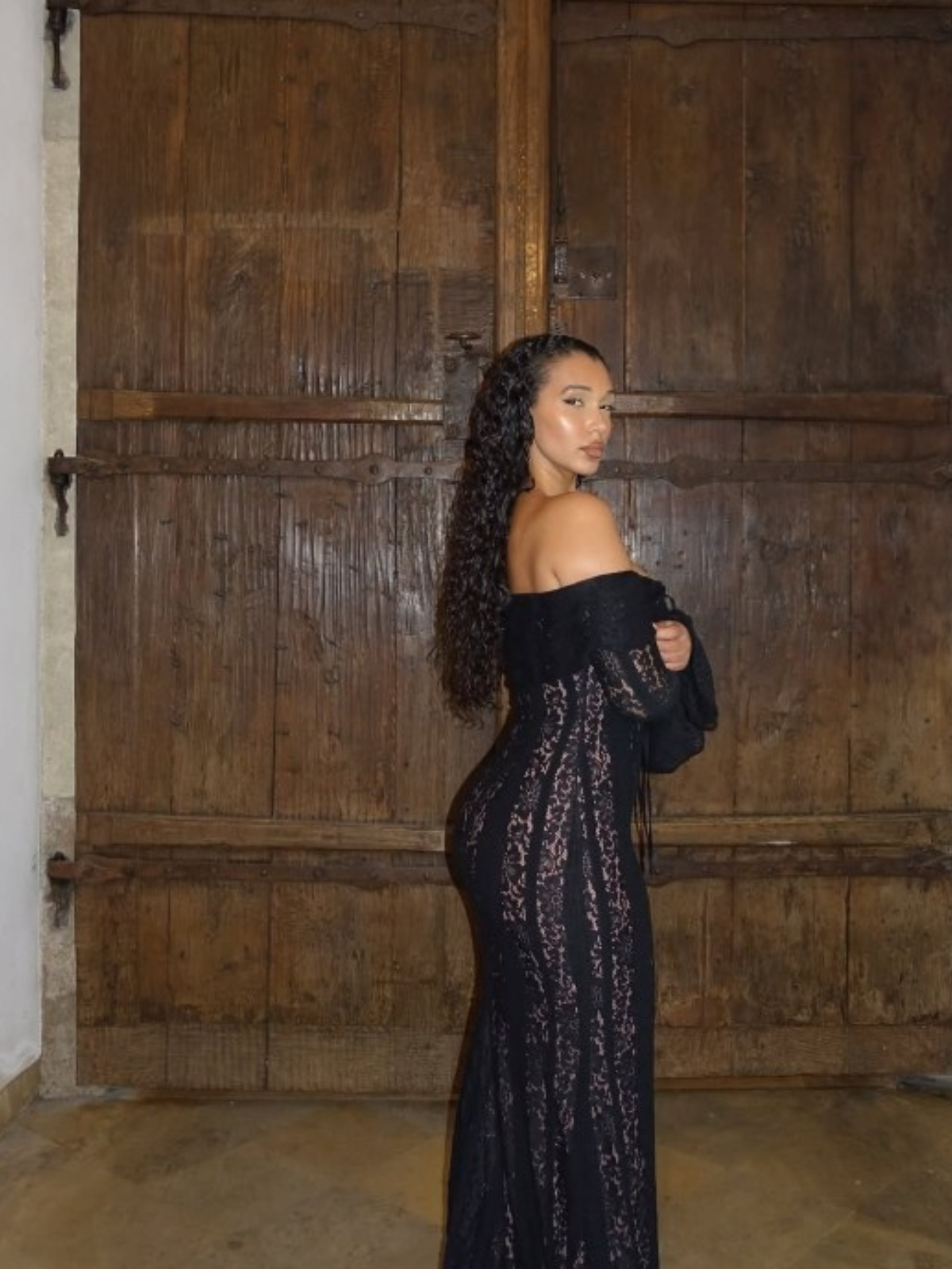 The 'Alessandra' maxi dress in black is here to bring the drama. Stretch floral lace hugs your curves in all the right places, with contrast lining adding just the right pop underneath. The off-shoulder bodice is boned for support (and a little extra wow), while fluted cuffs serve up a touch of flair.