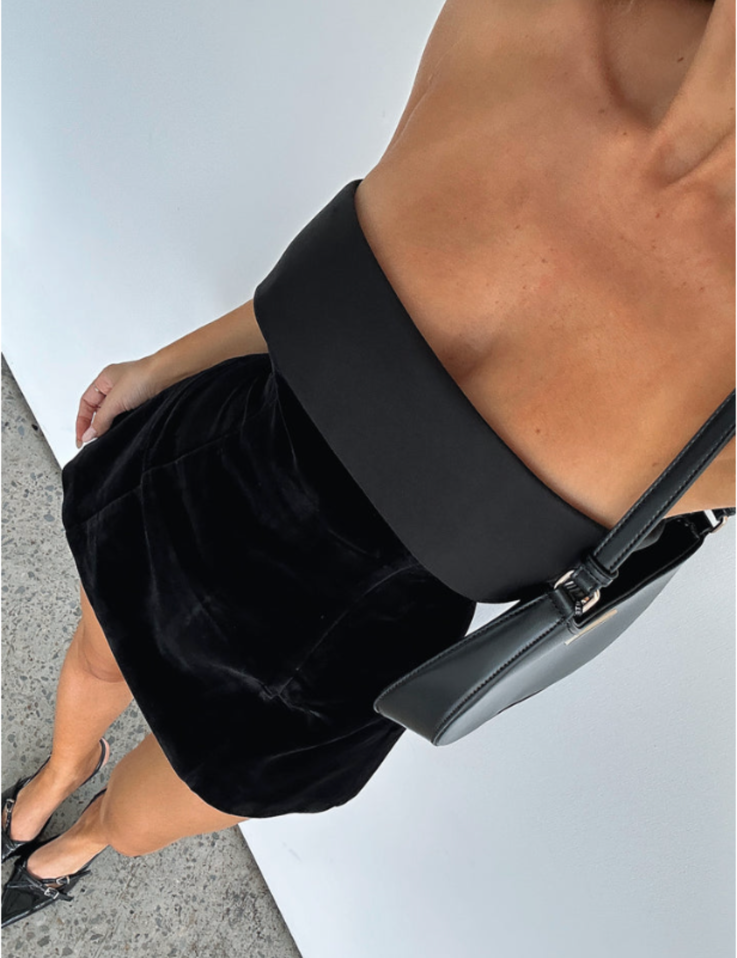 Some dresses make you shine, but 'Valentina' commands the spotlight. Crafted from a velvet-feel fabric in deep noir, this ultra-mini dress blends elegance with bold sophistication. The strapless bandeau neckline creates a timeless silhouette, while the hammered satin-fell fold-over detail adds an elevated touch. Perfect for glamorous evenings, cocktail parties, or any occasion where you want to turn heads.